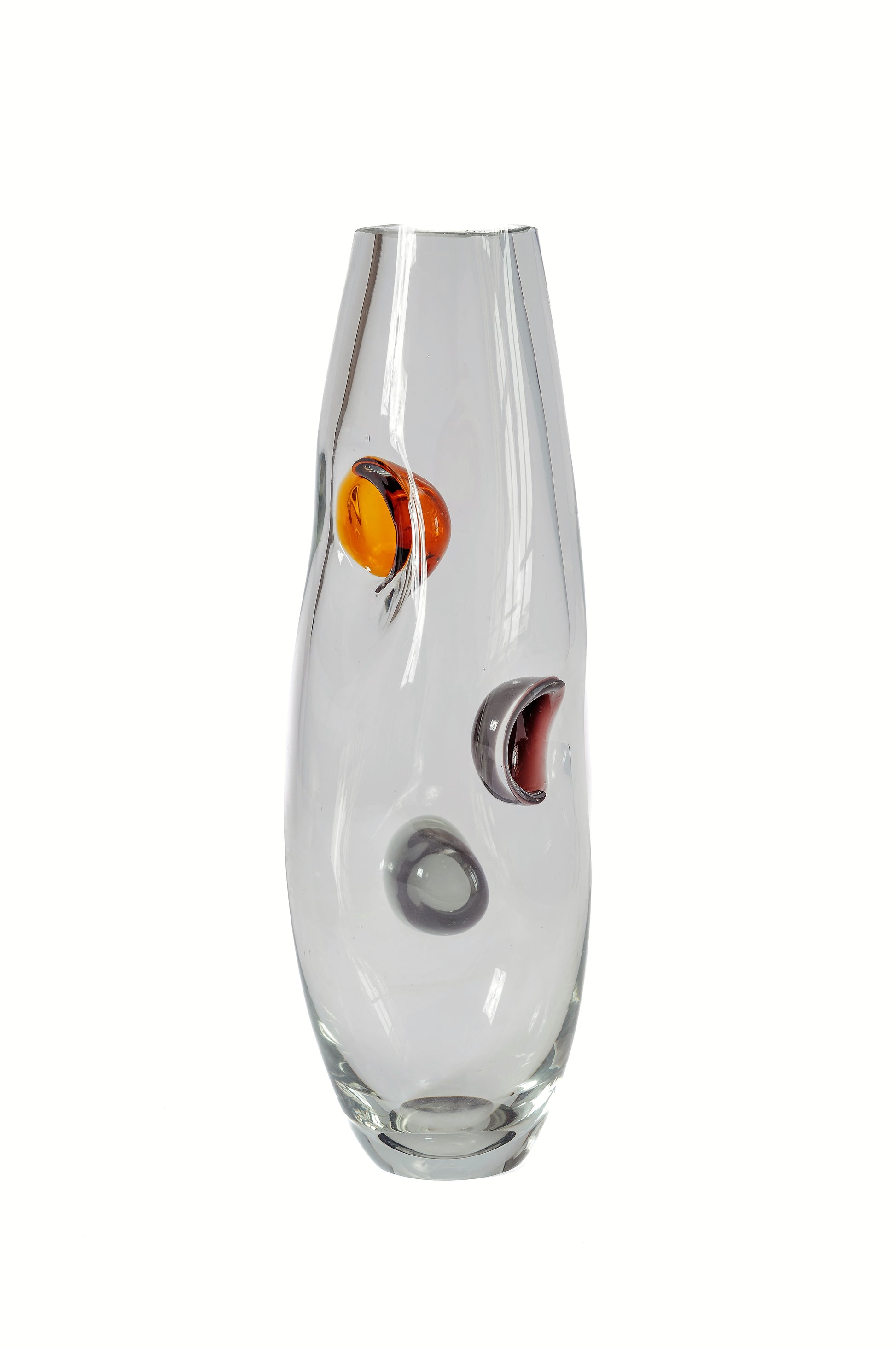 Modern and artistic, the Aura Spot Glass Vase features a tall, streamlined silhouette crafted from clear hand-blown glass. Its minimalist form is accented with rounded, colorful insets in amber, smoke, and deep plum tones—each appearing to float within the glass surface, making it a distinctive statement piece for contemporary interiors, whether styled with or without florals.