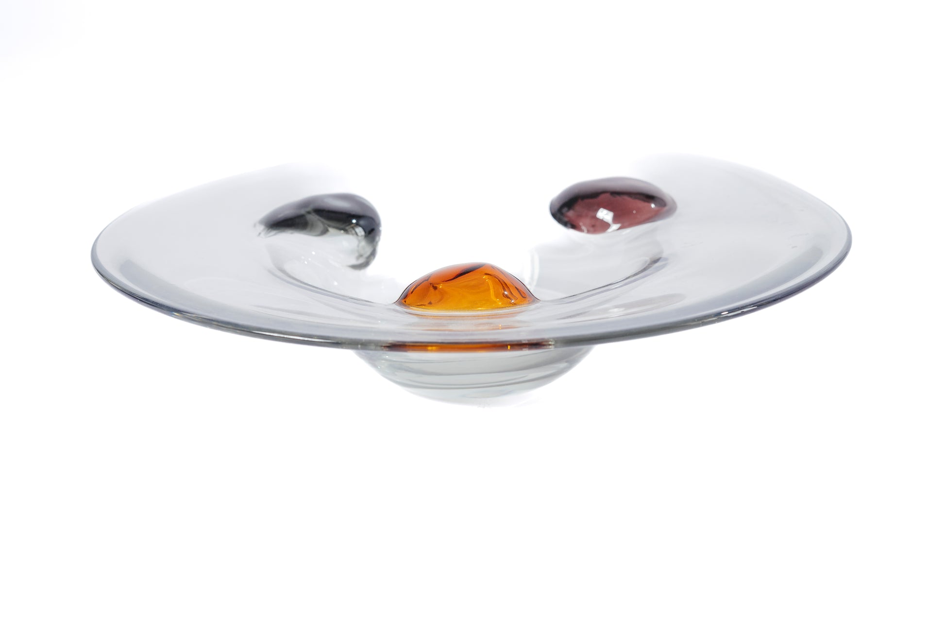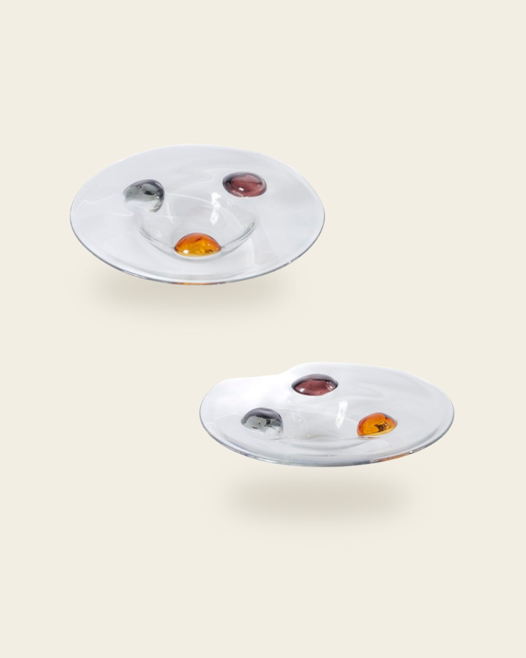 A true fusion of artistry and function, the Aurora Drops Glass Plate features a smooth, clear surface adorned with three embedded glass droplets in smoky grey, amber, and deep rose tones. Each droplet adds a dimensional accent, evoking the beauty of nature frozen in time. This sculptural plate serves as both a statement piece and a functional dish—ideal for serving appetizers, desserts, or simply as a decorative table accent.