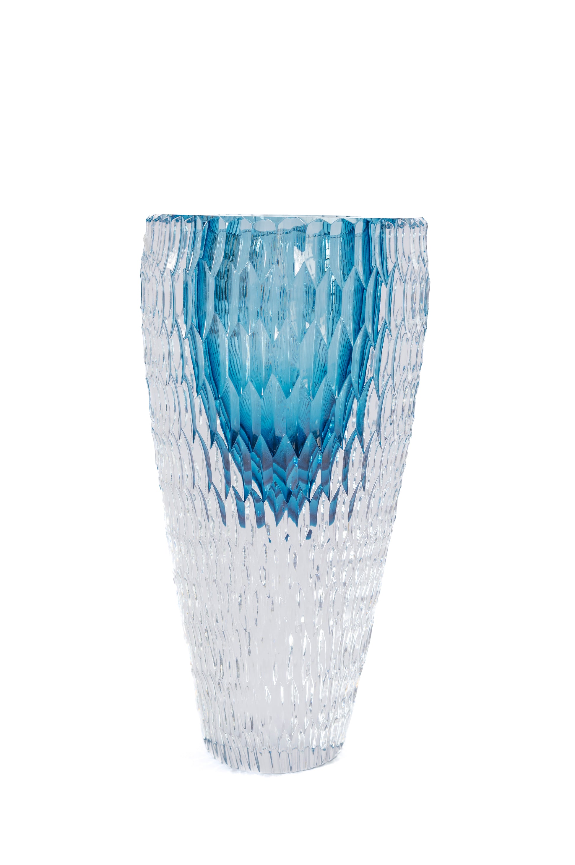The Glacial Cut Vase – Azure is a tall, refined vessel meticulously crafted from fine crystal glass. Featuring a dramatic hand-cut surface, its form captures and refracts light with brilliant clarity. The gradient azure core, reminiscent of frozen arctic waters, flows from deep blue to icy tones, creating a captivating sense of depth and movement. Whether used for floral arrangements or displayed as a standalone sculpture, this piece adds sculptural elegance and luminous beauty to any space.