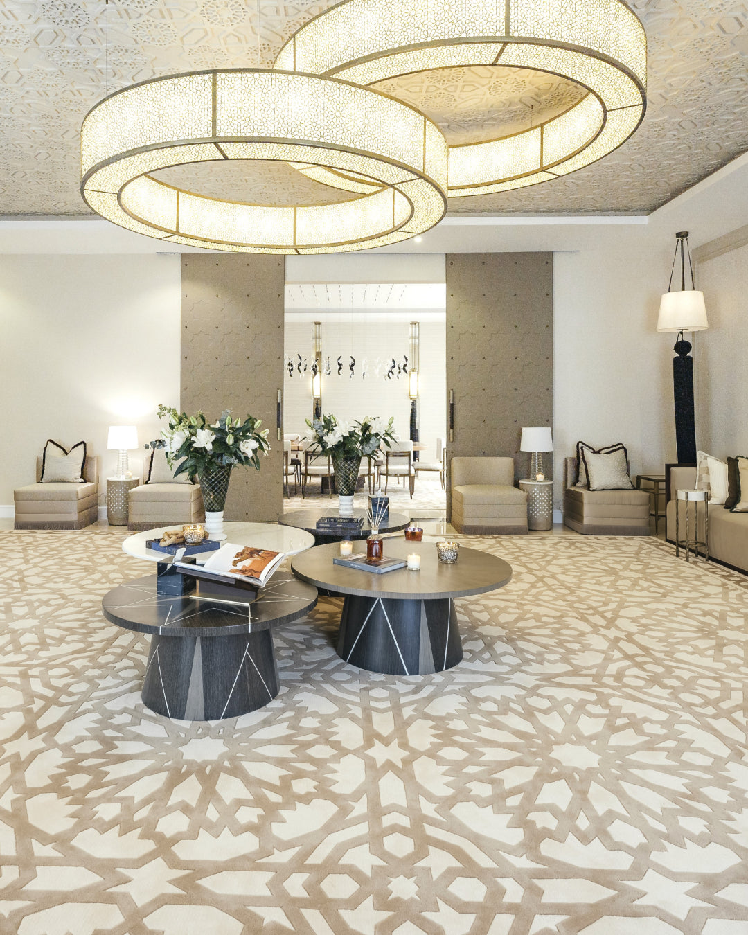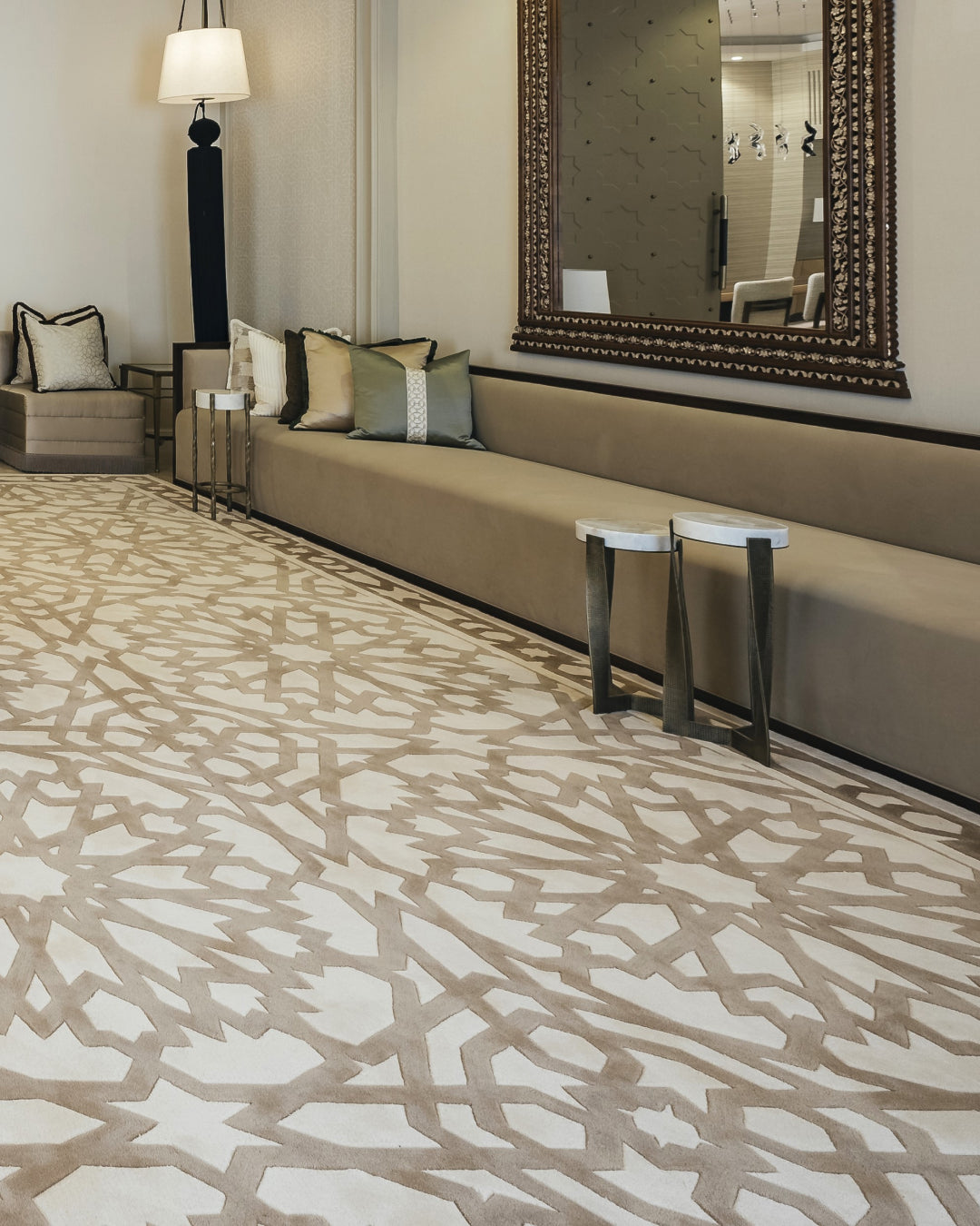 Elevate your space with the Golden Oasis Mat, a striking fusion of traditional craftsmanship and modern elegance. Featuring a repeating starburst and floral motif inspired by classic Moorish tilework, this rug brings structure and sophistication to any interior. The soft neutral palette—layered in warm beige, taupe, and cream—complements both contemporary and classic décor styles. Framed with an ornate border for added detail, it's perfect for grand living rooms, hotel lobbies, or formal dining areas where design meets scale.