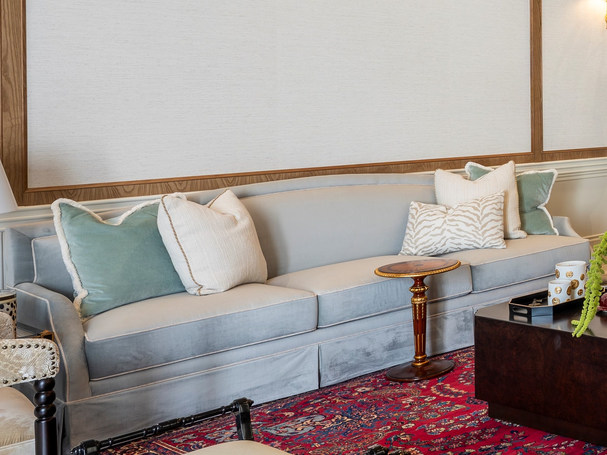 The Ophelia Lounge Sofa features a softly curved back, tailored upholstery, and a refined skirted base that together creates an elegant and inviting silhouette. Its balanced proportions and light, calming tone make it ideal for relaxed yet sophisticated living spaces.
