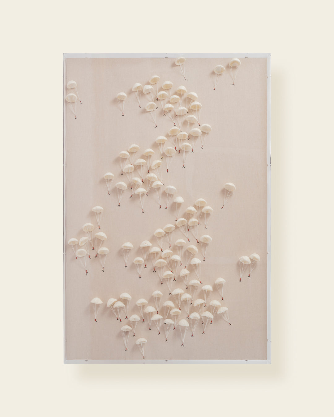 This piece is crafted using handmade miniature parachutes with fine thread suspensions, set against a neutral fabric-covered panel and encased within a clear acrylic frame.