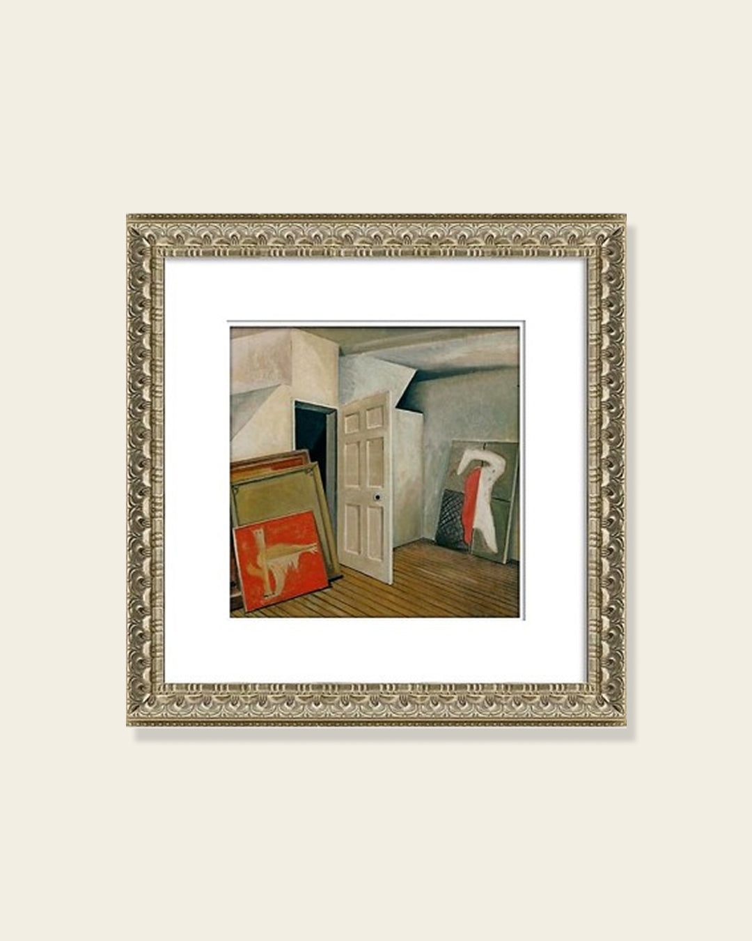 This elegant, framed artwork captures a tranquil interior scene with muted architectural forms and thoughtfully arranged canvases, evoking calm, introspection, and artistic solitude. Soft, neutral tones and subtle contrasts create a timeless composition, complementing classic, modern, or transitional interiors. Finished with an ornate gold frame and wide white mat, it adds gallery-style sophistication to living rooms, studies, or hallways.