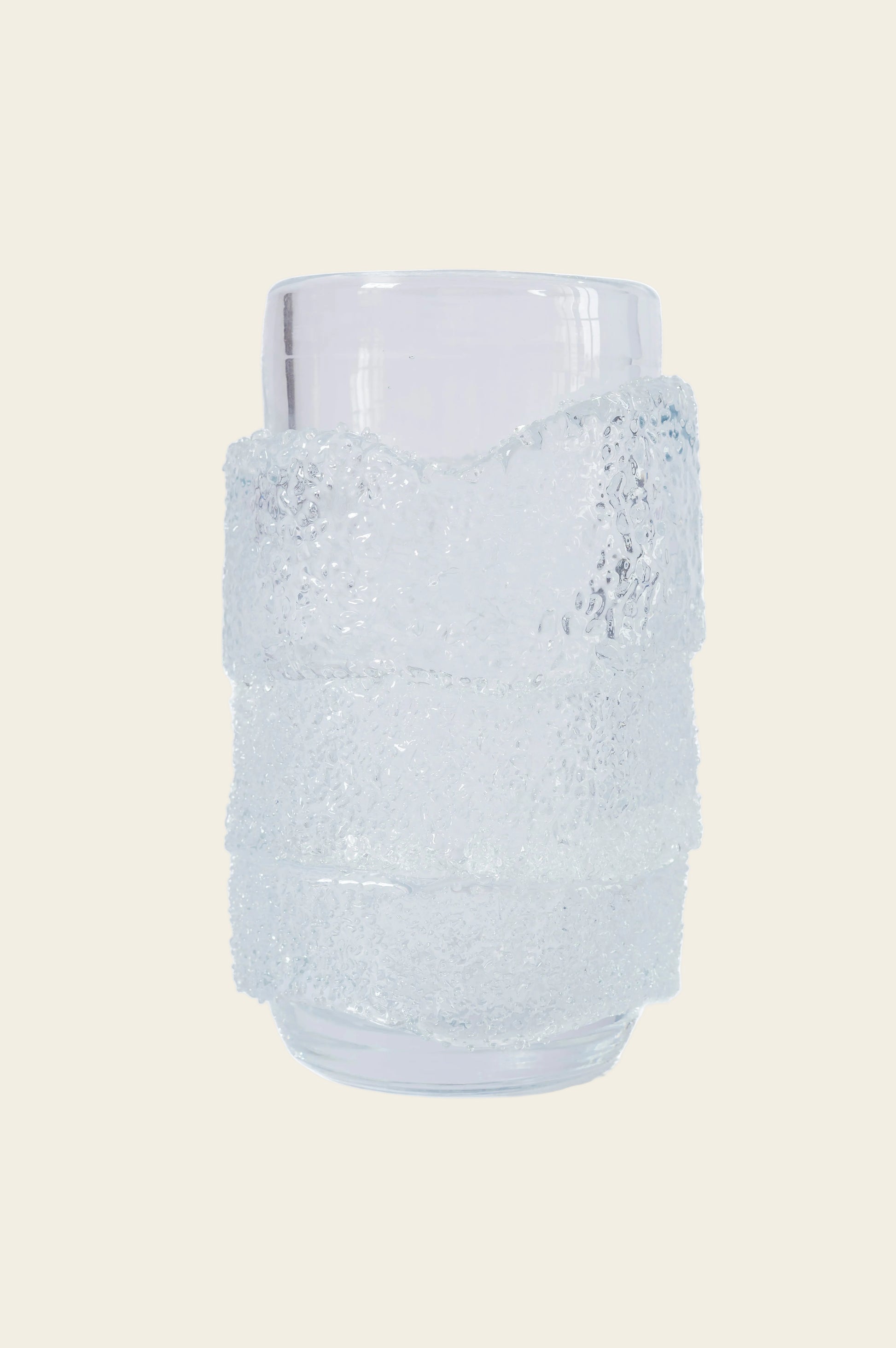 A sleek, modern glass tumbler encased in a frosted, textured sleeve that provides a tactile grip and artistic appeal. The clear glass body contrasts beautifully with the textured exterior, making it ideal for serving beverages with elegance and style. Perfect for both casual and sophisticated settings, this piece adds a unique touch to your drinkware collection.