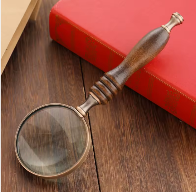 Crafted with a solid wooden handle, an antique brass–finished metal frame, and a clear glass magnifying lens.