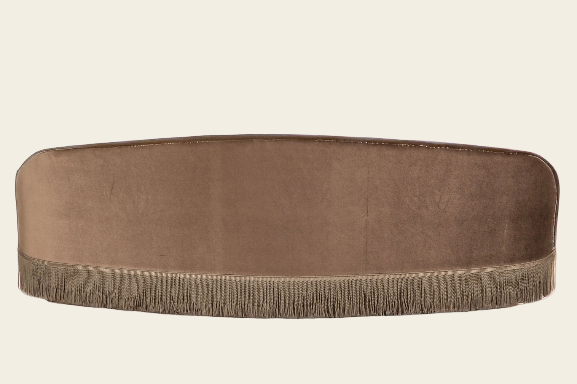 An elegant sofa with a smooth, continuous silhouette and gently rounded arms. Upholstered in soft velvet, it features a deep, comfortable seat and a refined fringe detail along the base, giving it a vintage-inspired yet timeless look. The warm brown tone and sculptural shape make it a statement piece suited for living rooms, lounges, or boutique interiors.
